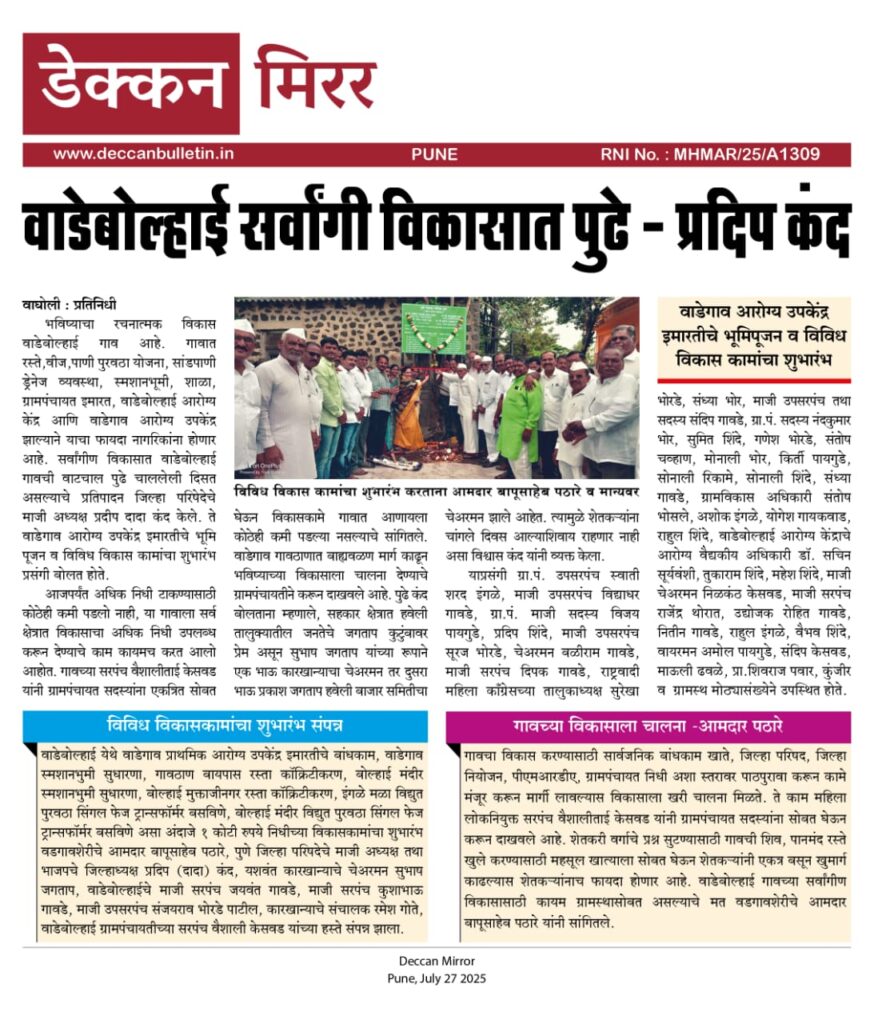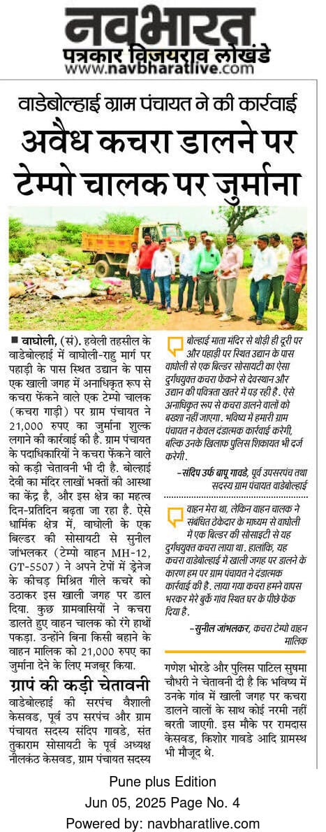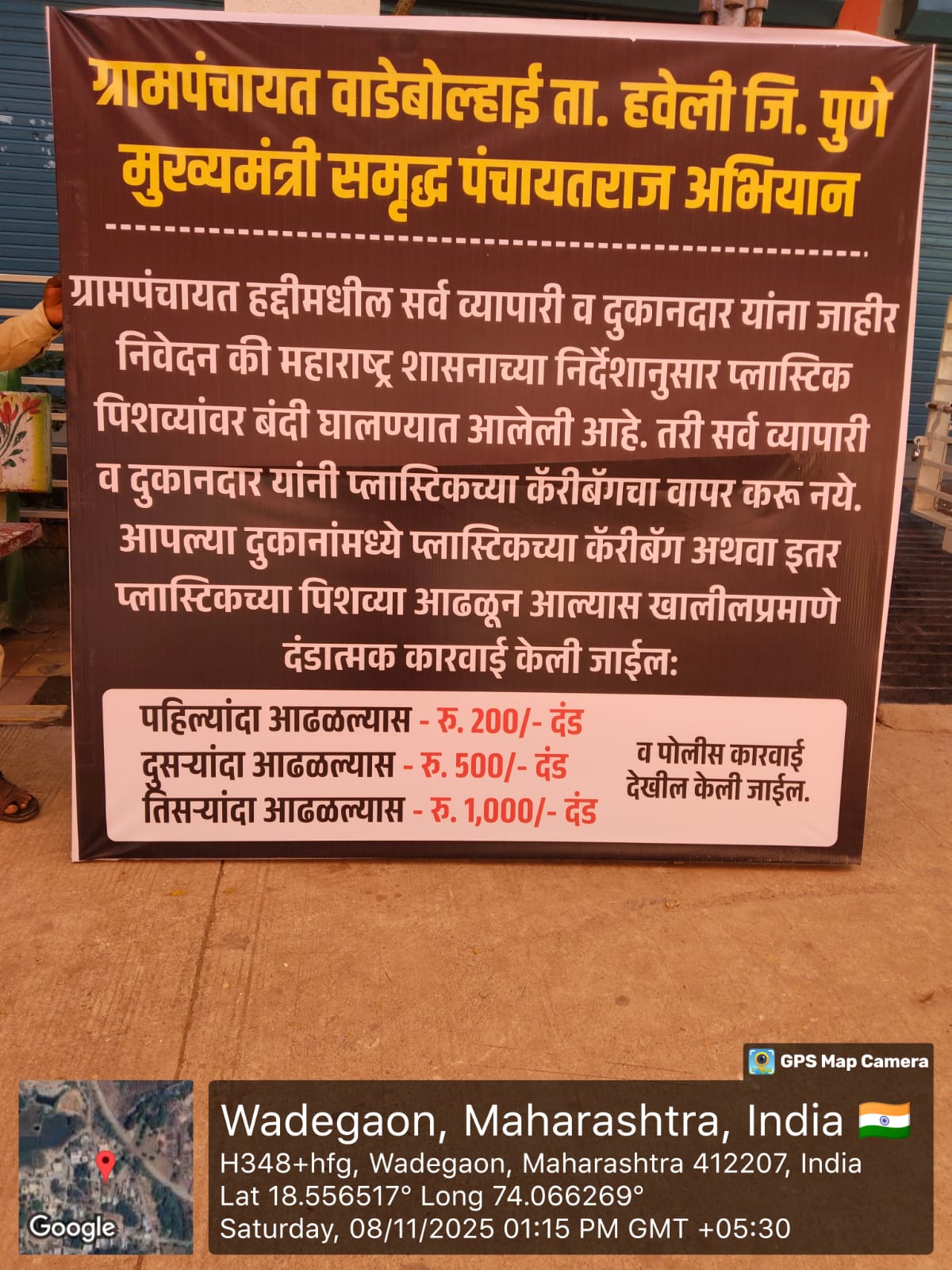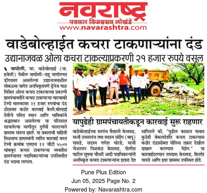 ग्रामपंचायत वाडेबोल्हाई "शब्दांपेक्षा काम जास्त बोलते " यावर विश्वास ठेवते. या गॅलरीद्वारे, आम्ही आमच्या गावाच्या विकासाचा प्रवास अभिमानाने सादर करतो - स्वच्छता मोहीम आणि रस्ते बांधकामापासून ते सार्वजनिक कल्याणकारी उपक्रमांपर्यंत.