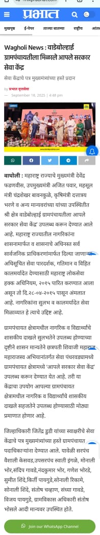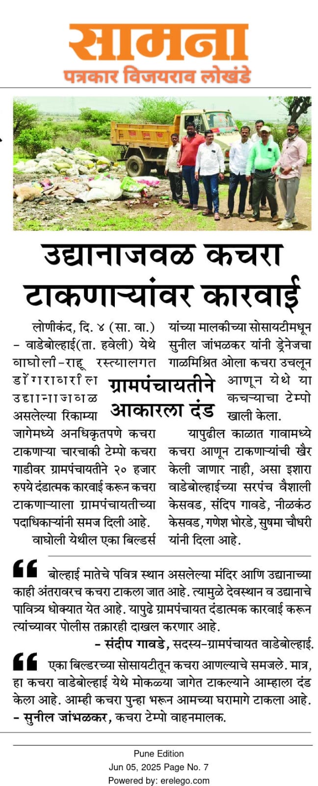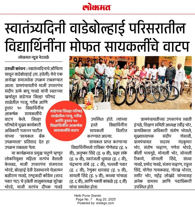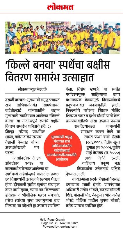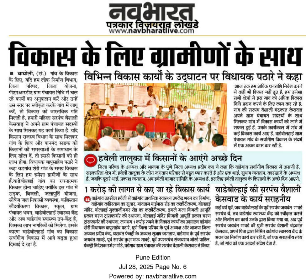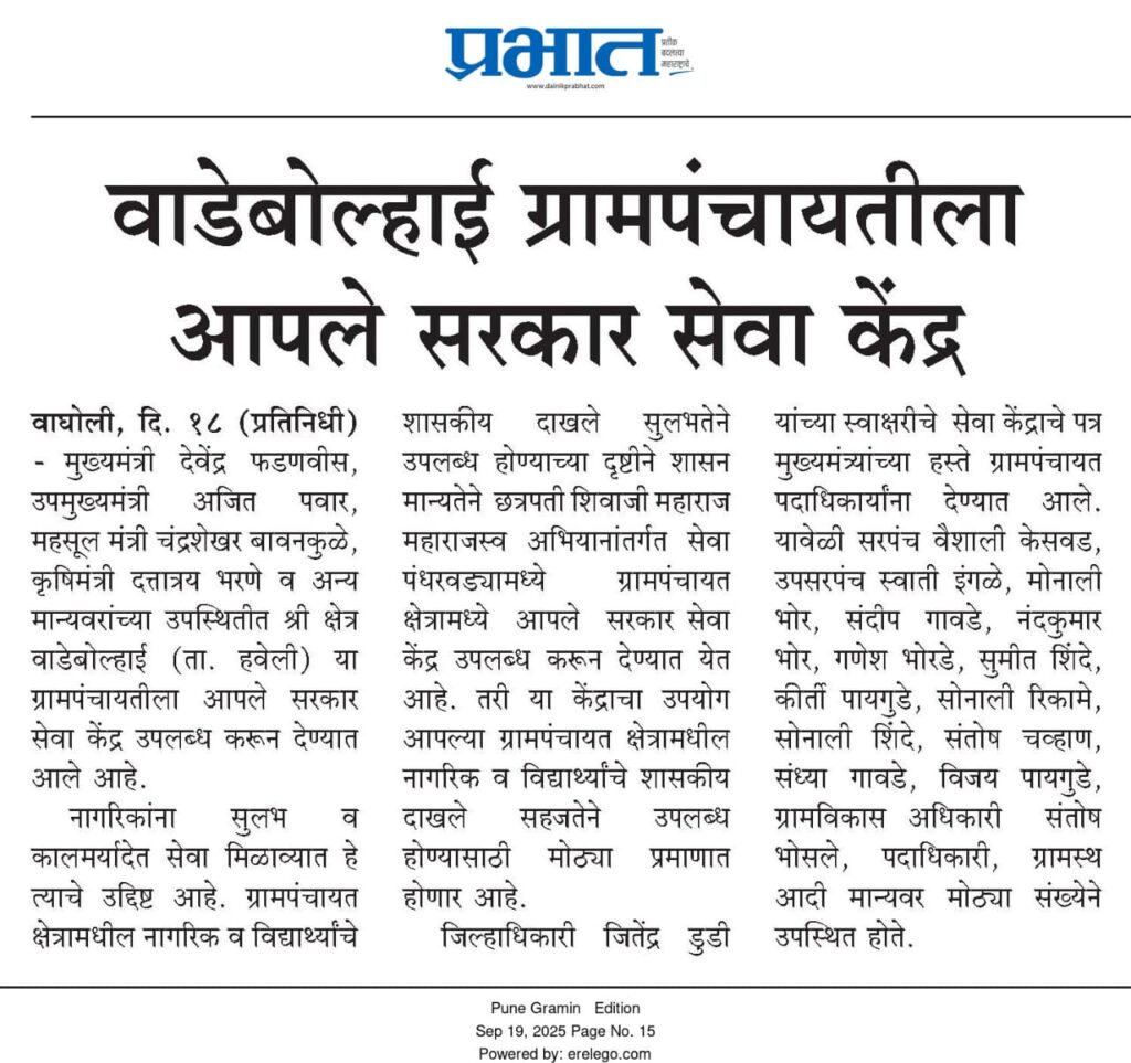 ग्रामपंचायत वाडेबोल्हाई "शब्दांपेक्षा काम जास्त बोलते " यावर विश्वास ठेवते. या गॅलरीद्वारे, आम्ही आमच्या गावाच्या विकासाचा प्रवास अभिमानाने सादर करतो - स्वच्छता मोहीम आणि रस्ते बांधकामापासून ते सार्वजनिक कल्याणकारी उपक्रमांपर्यंत.